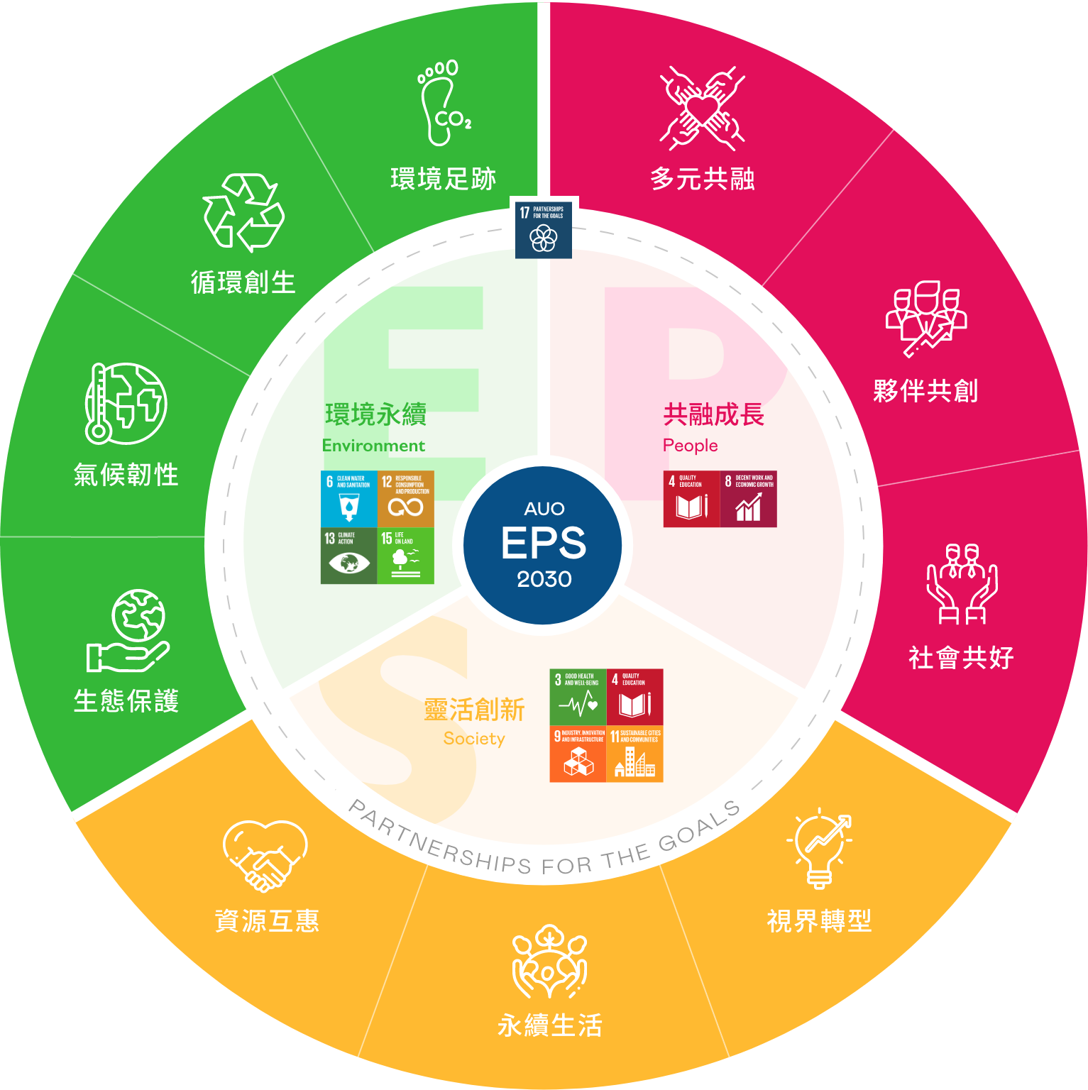 接軌聯合國SDGs永續發展目標,友達光電以「超越企業社會責任,創造共享價值」為願景,訂出EPS三大永續發展主軸,並延伸訂定具體目標引領行動,擘劃企業永續策略路徑。